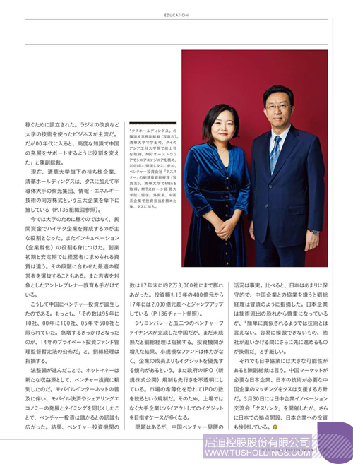 啟迪控股是清華大學的“校辦企業(yè)”,總資產達2000億元(約3兆4000億日元)。20世紀80年代到90年代,隨著政府機構改革的深入,中國的大學開始設立自己的公司。啟迪控股的前身為清華科技園發(fā)展中心,成立于1994年,是許多清華大學企業(yè)的聚集地。2004年正式更名為啟迪控股。