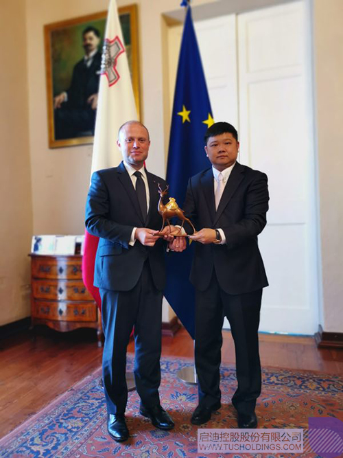 啟迪三螺旋代表團向約瑟夫·穆斯卡特總理(左)贈送北京故宮館藏文物復制紀念品