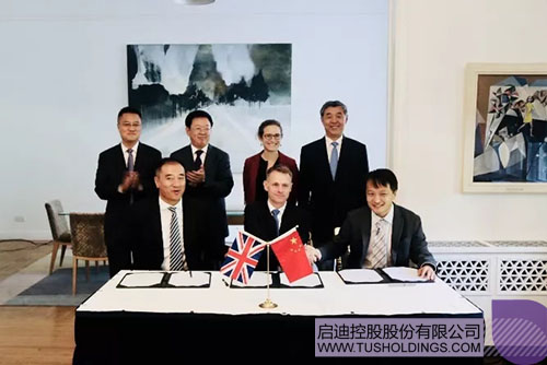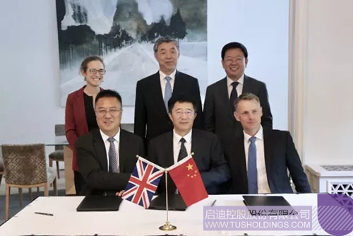 啟迪明石董事許維強(前排左),ORE CATAPULT創(chuàng)新與研究部總監(jiān)Stephen Wyatt博士(前排中),啟迪清潔能源集團高級副總裁、啟迪清風總經(jīng)理杜瑛卓(前排右一)代表三方共同簽署成立“啟迪中英海洋科技研究院”的協(xié)議