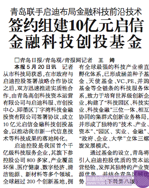 青島日?qǐng)?bào)5月21日頭版報(bào)道:記者從市科技局獲悉,在市政府與啟迪控股簽署戰(zhàn)略合作協(xié)議之后,雙方迅速推進(jìn)實(shí)質(zhì)性合作,由青島高創(chuàng)科技資本運(yùn)營(yíng)有限公司與啟迪科服、市創(chuàng)投中心、即墨區(qū)丁字灣科技金融投資有限公司簽署協(xié)議,成立10億元啟信金融科技創(chuàng)投基金,以推動(dòng)我市新一代信息技術(shù)等科技成果的落地轉(zhuǎn)化。