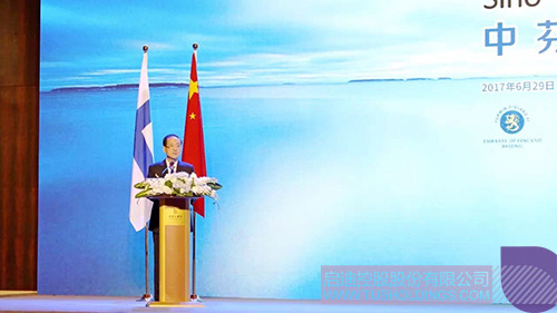 “建交67年以來,友好、互利、合作已經(jīng)成為中芬關(guān)系的主旋律。今年4月,習(xí)近平主席在對(duì)芬蘭進(jìn)行國(guó)事訪問期間,兩國(guó)領(lǐng)導(dǎo)人確立了面向未來的新型合作伙伴關(guān)系,譜寫了中芬關(guān)系的新篇章,開啟了中芬合作的新政策?!表n啟德副主席回顧了中芬合作成果,認(rèn)為中芬戰(zhàn)略高度契合,經(jīng)濟(jì)互補(bǔ)優(yōu)勢(shì)更加凸顯,務(wù)實(shí)合作潛力巨大,前景廣闊。他圍繞“創(chuàng)新”、“綠色”、“可持續(xù)”三大關(guān)鍵詞,提出雙方未來的主要合作方向,希望雙方政府、企業(yè)、企業(yè)家攜手為中芬兩國(guó)經(jīng)濟(jì)增長(zhǎng)作出新的貢獻(xiàn)。