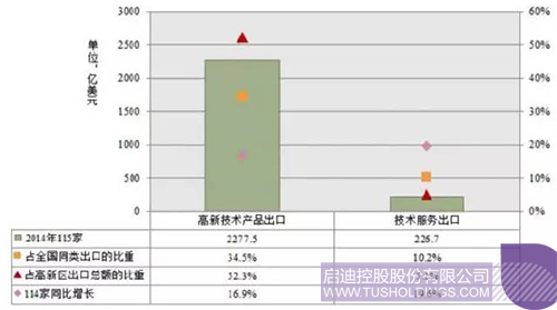國家高新區(qū)積極鼓勵企業(yè)開拓和利用國際市場,通過重點發(fā)展高附加值的高新技術產(chǎn)品和技術服務出口,優(yōu)化和升級出口貿(mào)易結構,在激烈的國際競爭市場占有一席之地。2014年國家高新區(qū)企業(yè)高新技術產(chǎn)品出口總額達2,277.5億美元,占全國高新技術產(chǎn)品出口比重的34.5%,同比增長16.9%。企業(yè)實現(xiàn)技術服務出口總額226.7億美元,占全國服務出口比重達10.2%,同比增長達19.6%。